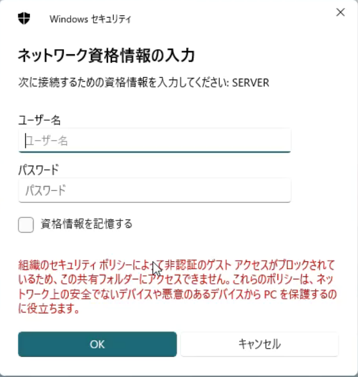 組織のセキュリティ ポリシーによって非認証のゲスト アクセスがブロックされているため、この共有フォルダーにアクセスできません。これらのポリシーは、ネットワーク上の安全でないデバイスや悪意のあるデバイスから PC を保護するのに役立ちます。