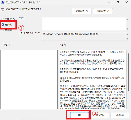 安全でないゲスト ログオンを有効にしてOKをクリック。