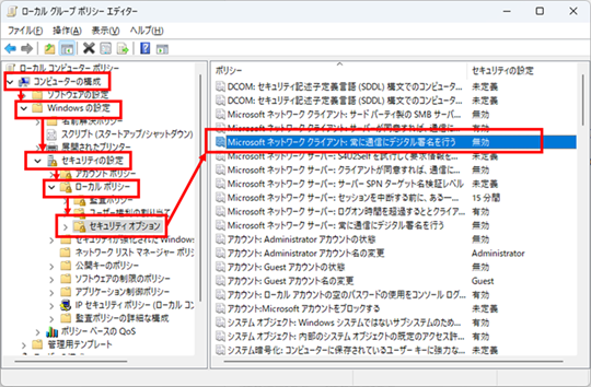 5.2箇所目:「Microsoft ネットワーク クライアント:常にデジタル署名を行う」を無効に
